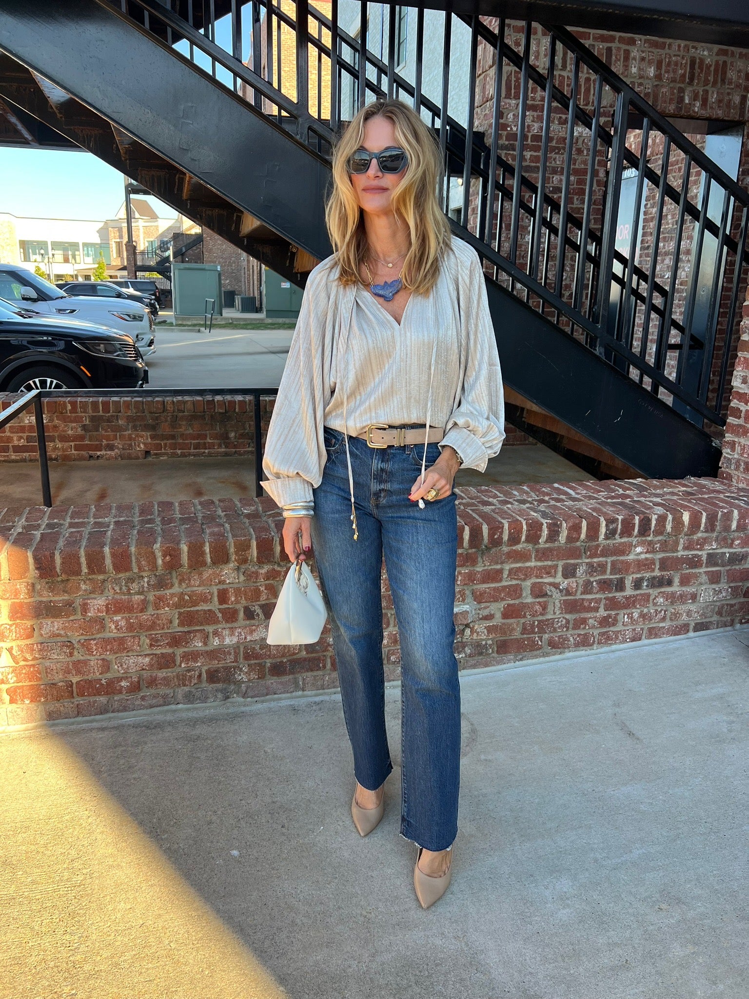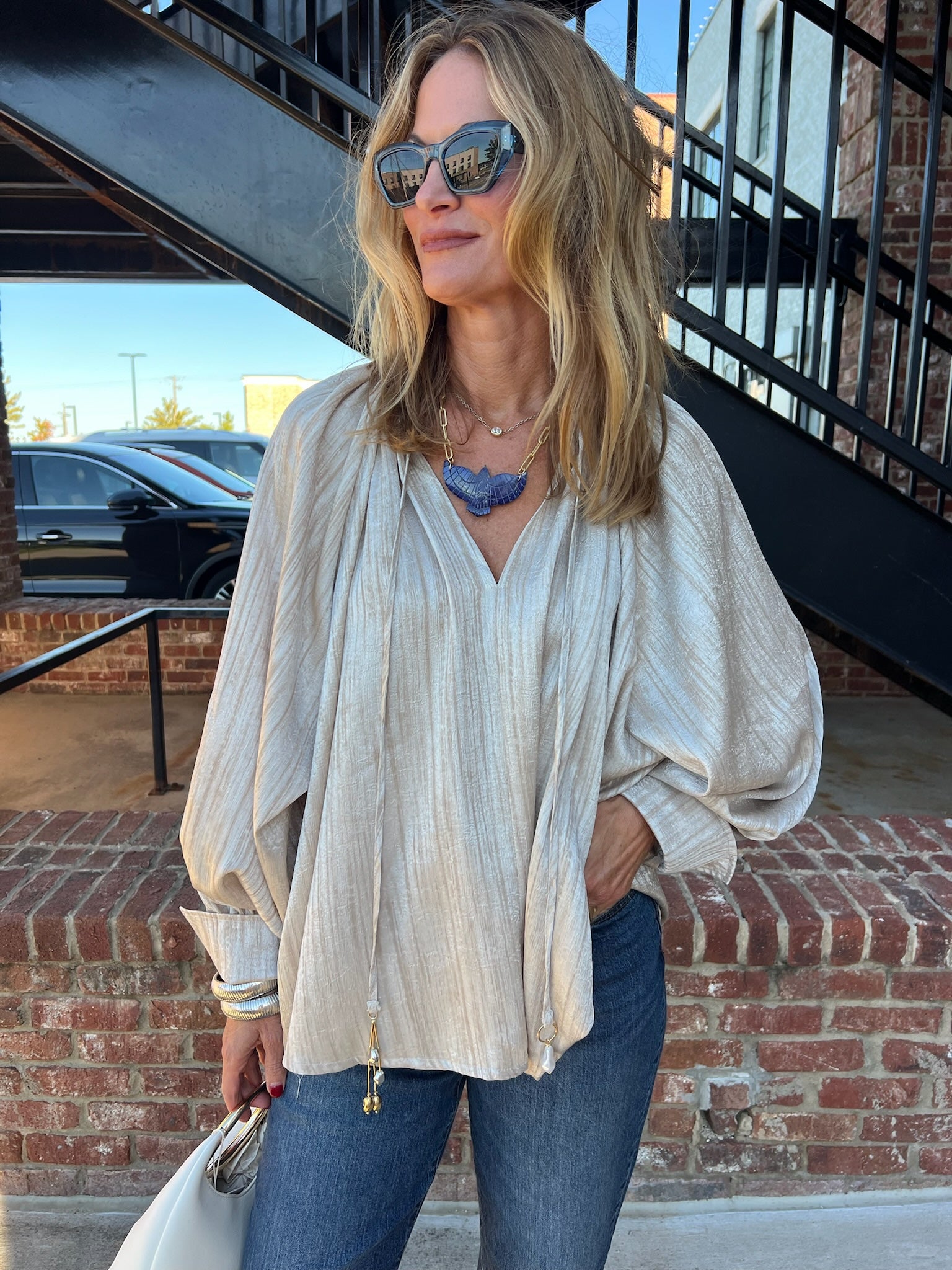 Elevate your look with the Victoria Metallic Blouse in silver, a luxe piece that shimmers subtly in the light. The silver - champagne hue, flowy silhouette, and draped balloon sleeves give it an effortless sophistication, while the adjustable tassel ties add a touch of detail. It’s the perfect blend of relaxed and refined.