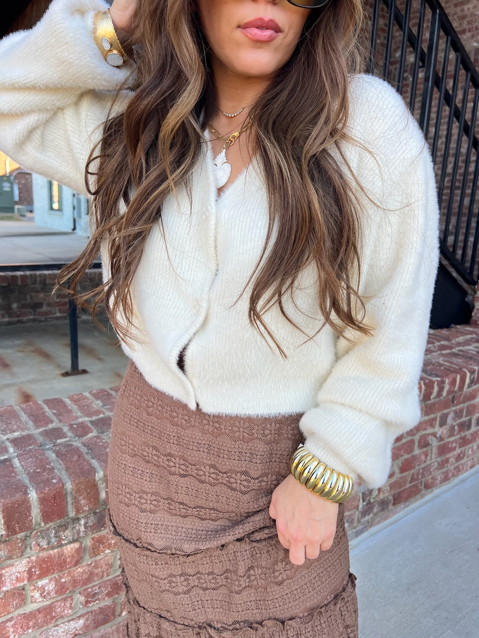 Soft, airy yarns and a cropped, button-front silhouette give this cardigan its fresh feel. Wear it solo for a minimal look or layered over your favorite tanks and tees for extra cozy charm.